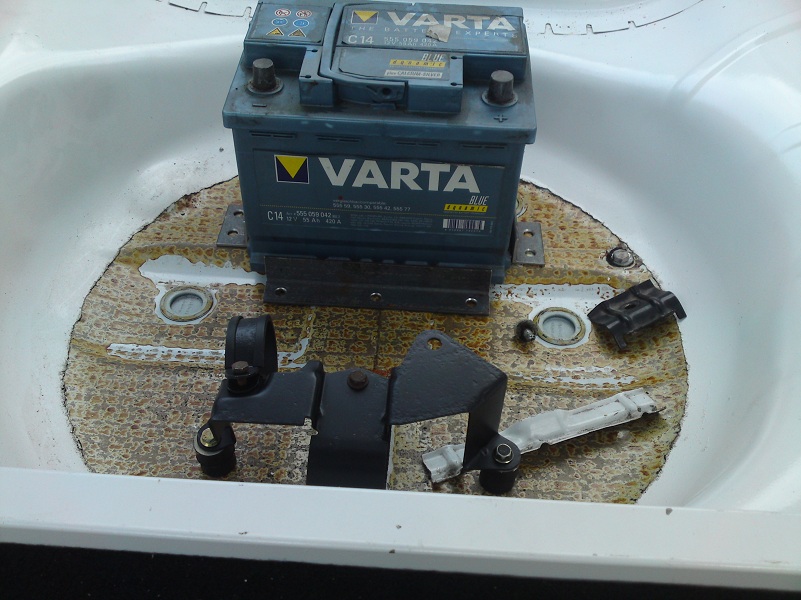 Batterie und Benzinpumpenhalter wandern nach und nach in die Ersatzradmulde.