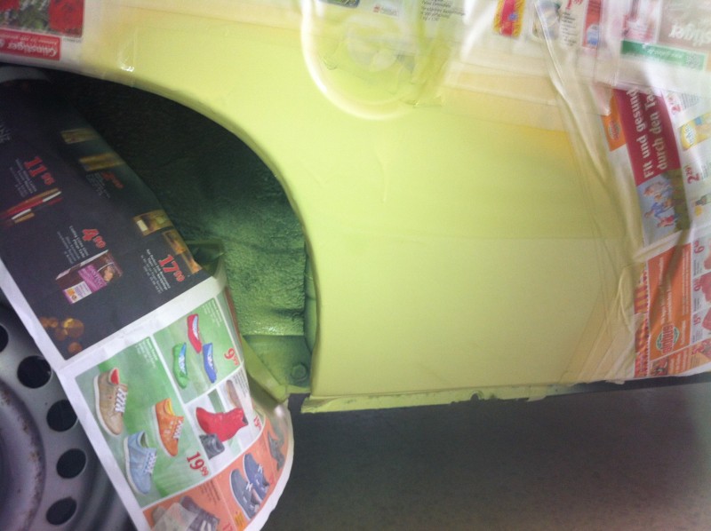 Der Linken Seitenwand ist zwar Gelb aber ich bin mit dem Ergebnis nicht zufrieden. Also muss es nochmal gemacht werden. Die Temperatur von der Dose und Raum + Auto waren leider zu niedrig, Lack hat eine Orangenhaut bekommen.