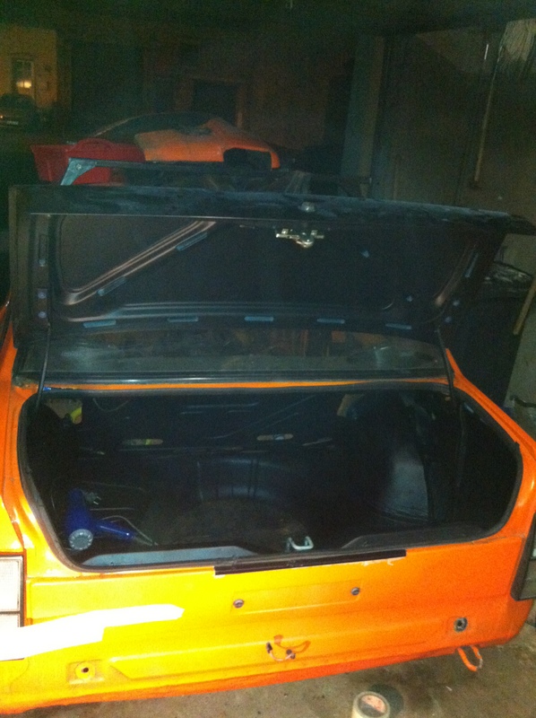 So nun ist auch der Kofferaum schwarz gemattet. Der lackierte Heckdeckel montiert und die Motorhaube gespachtelt das ich sie morgen lackieren kann.