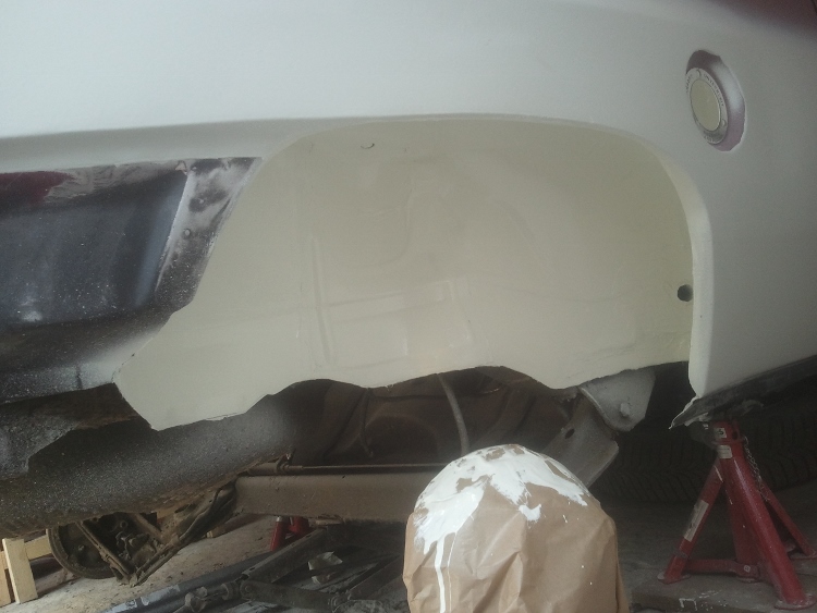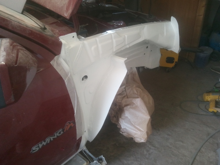 Der Radlauf ist so gut wie fertig verspachtelt, Felge passt mittels 15mm Spurplatte auch optisch in den Radkasten. So wird es werden denke ich. Weißes Auto, weiße Felgen.
