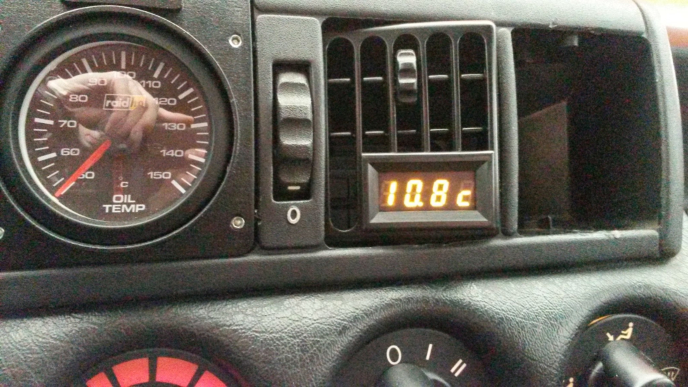 Und dann habe ich noch nach einer kleinen digitalen Uhr gesucht, da diese für die Öltemperaturanzeige weg kam. Ich habe eine kleine gefunden, welche auch noch eine Temperaturanzeige und ein Voltmeter hat. Ich habe sie in die Lüftungsdüse eingebaut und bin bis jetzt begeistert.