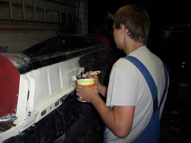 so gestern ging es weiter... haben den unterboden komplett sauber gemacht und ich hab die risse unter den sitzen ausgebohrt und neue bleche eingeschweißt. danach hab ich schonmal eine schicht des ersten wundermittels aufgetragen. ich finde das ergebnis kann sich sehen lassen :)