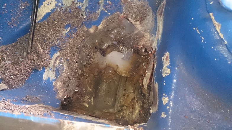 Ich hab mich dann erstmal mit Zopfbürste und Schutzbrille bewaffnet und geschätzte 5 Kilo Dichtmasse im Motorraum entfernt dabei hab ich Folgende Sachen gefunden :
