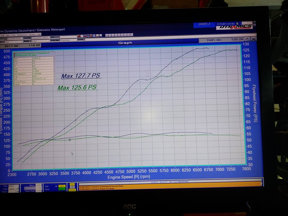 Am 3.11. war es soweit. Mit wiederbelebtem Steuergerät, Leistungsfähigeren Einspritzdüsen und stärkerer Spritpumpe ging es auf den Prüfstand. Ziel war es wieder ein gut fahrbares Mapping rauszufahren. Dies gelang uns sehr gut-Leistung steht nun über das gesamte Drehzahlband im Schnitt 500-800 U/min früher an. Auch die Drehmomentkurve konnte noch weiter geglättet werden. Leistung dazu gewonnen haben wir nicht bzw. konnten es nicht abschliessend versuchen, da die neue (5 Betriebsstunden alte) Spritpumpe den geist aufgab. So ist es manchmal im leben. Also Prüfstandstermin abgebrochen und ab nach Hause...
