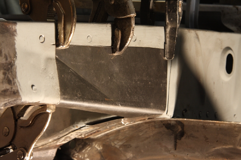 Erst mal einpassen: Die "Anlauf-Flecken" hab ich mit nem kleinen Gasbrenner gemacht, damit ich die Schweißpunkte auf der anderen Seite wieder finde. Natürlich vor dem Verschweißen wieder angeschliffen.