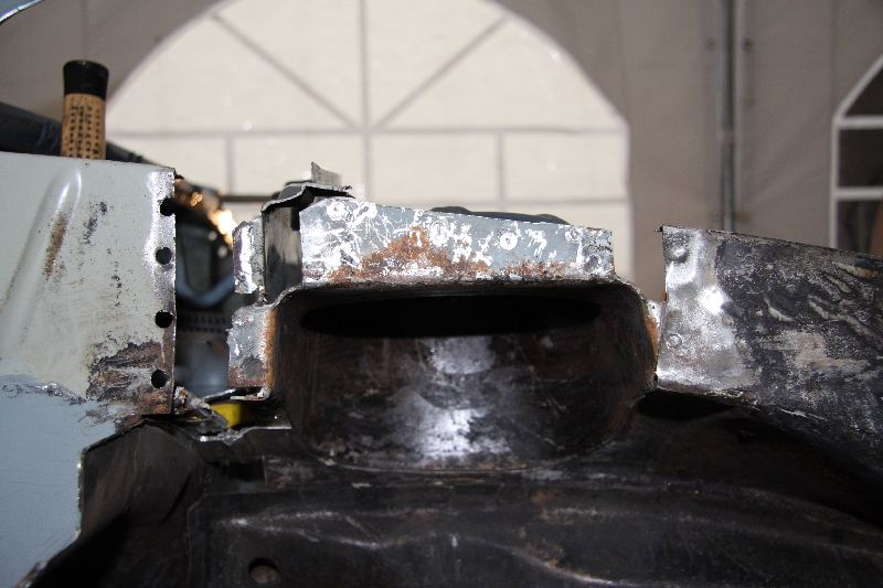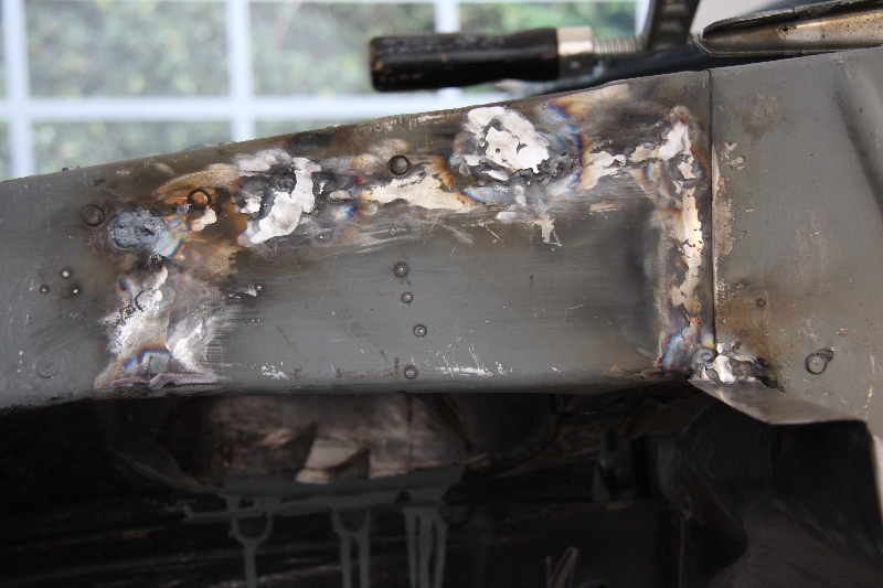 Die Stelle mit neuem Blech. Und die Ecke und Kante am Innenradlauf ist auch gemacht. War ne ganzschöne Fic...ei kopfüber zu schweißen. Und die Einpasserei des neuen Teils erst... Das nimmt fast die meiste Zeit in Anspruch.