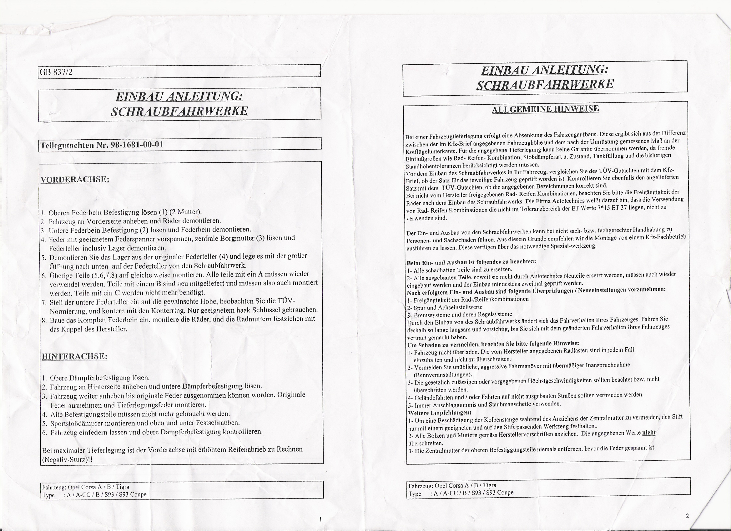 hab mir für meinen a corsa ein gewindefahrwerk geholt..von supersport. kann mir jemand sagen was ich alles oben aufs federbein schrauben muss? reicht nur das domlager+kugellager oder auch noch der federteller oderso?? hat jemand evtl sogar ne einbauanleitung für mich oder fotos??