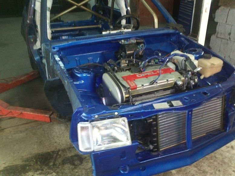 ich bin schon länger im Forum dabei, aber bisher habe ich meistens nur den Teilemarkt genutzt. Mein Name ist Jörg (86er Bj) und ich komme aus Gera (Thüringen). Schraube schon seit Jahren an Opels und habe 2011 mich für ein Corsa A Projekt mit c20xe entschieden. Nachdem mein erster Corsa Kauf ein Fehlgriff war (Karosse verzogen), habe ich im August '11 eine gute Leerkarosse (Bj 89) gekauft. Diese habe ich in Berlin-Rüdersdorf gekauft, der alte Besitzer war durch sein Corsa Taxi bekannt. Im ersten Arbeitsgang habe ich die wenigen Roststellen beseitigt und den Unterboden neu konserviert. Danach alle Karosseriearbeiten nach meinen Vorstellungen durchgeführt. Ich wollte die Optik des Vorfacelift GSI bekommen. Ich baute zusätzlich einen bösen Blick, entfernte die Schlösser, cleante die Heckklappe und arbeitete eine neue Kennzeichenmulde ein. Der Innenraum sollte sehr einfach gehalten werden, durch einen Käfig und Schalensitze. Das Armaturenbrett ist komplett entfernt und alle Bedienelemente als universelle Schalter in einer Bedieneinheit ersetzt. Als Farbe wollte ich Ardernblau vom Opc haben, jedoch versuche ich mich mit einer Selbstlackierung. Als erstes habe ich den Motorraum und den Innenraum lackiert.