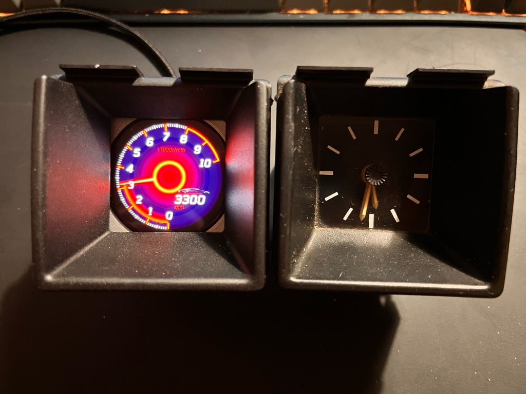 Hab mich jetzt dazu entschieden ein rundes OLED zu nehmen und dieses in ein originales Uhrengehäuse zu packen. Momentan ist es noch über ein USB-Kabel angeschlossen, aber im Idealfall kann ich später einfach den originalen Stromanschluß der Uhr verwenden.