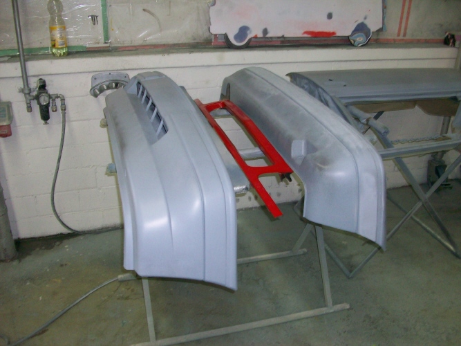 Also zuerst mal für schöne Radlaufabschlüsse die Stossstangen schön eingepasst mit Grill etc und dann gleich mal alle Aussenteile demontiert und schon mal dem Lackierer gebracht zum vorbereiten...