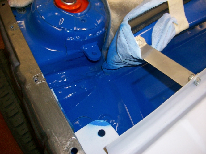 Pedalen eingepasst und dann die ganze Pedalerie rausgenommen damit der Lackierer weniger Abdecken muss und ich die dann auch noch selber mit schwarz matt Lackieren kann... Dann die Spritzwand vorne mit Käfigaufnahmen etc alles blank geschliffen und vorgrundiert... danach die Domabstützung vorne noch verschliffen grundiert und gelackt und endlich hattte ich es geschafft, der Maler hat am Freitag dann die Kiste mit dem Tieflader abgeholt...