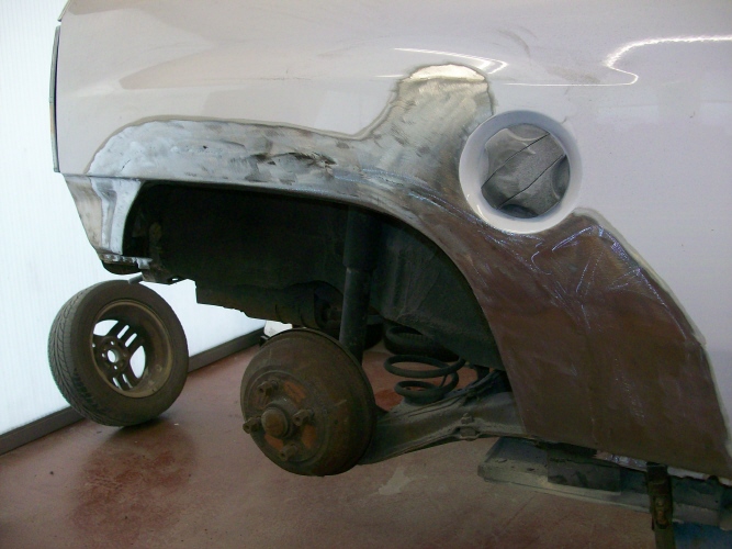 Und dann war ich wieder mal beim Lackierer und er hat tatsächlich begonnen mit der karosserie... :D Seitenwände gespachtelt und aussen und innen gefüllert (Füller leicht blau eingefärbt keine Ahnung wofür das gut sein soll aber egal) Geschliffen und mehr oder weniger bereit für die Lackierung... Als ich aber sah das er tatsächlich teilweise wieder Kit reingeschmiert hatte hinten um die Radkästen hat mich fast der Schlag getroffen... :evil: :? :cry: :x :shock: dann musste halt einer alles wieder rauskratzen und reinigen etc... zum Glück noch gesehen bevor die Farbe drauf gekommen ist... hab dann ein bisschen geholfen wieder entfernen aber hab mich natürlich schön geärgert... Ich kratze in vielen Mühsamen Stunden alles weg und der schmiert wieder drauf... naja jetzt is es wieder wie vorher... Wer will den schon Kit auf einem Rennwagen der wird sowieso überall reinpissen und hab ja kein Teppich mehr drin der sich vollsaugen kann...
