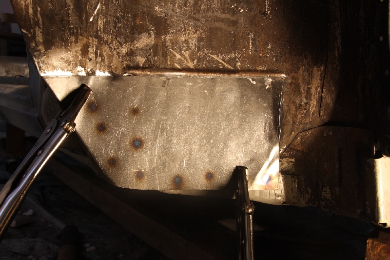 Die Stelle mit neuem Blech. Und die Ecke und Kante am Innenradlauf ist auch gemacht. War ne ganzschöne Fic...ei kopfüber zu schweißen. Und die Einpasserei des neuen Teils erst... Das nimmt fast die meiste Zeit in Anspruch.