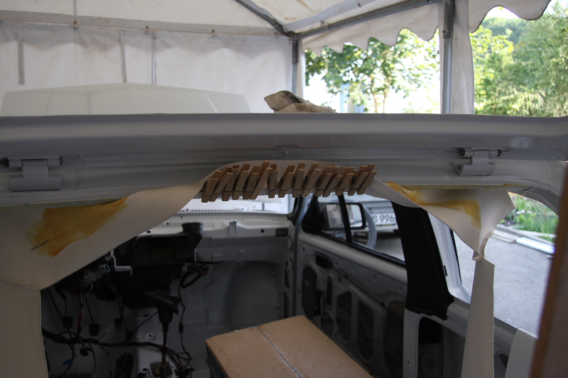 Wie dem auch sei, der neue Himmel ist ja jetzt da und wartet nur noch darauf eingebaut zu werden. Erstmal hängt er nur lose drin und mit den Wäscheklammern nur mal in Position gebracht um zu schauen ob auch alles passt. Naja die C-Säulen-Stücke sehen momentan noch etwas kurz aus. Muss ich aber nochmal schuen, vielleicht lässt sich das noch etwas ziehen. An sonsten werden die auch durch was schwarzes ersetzt.