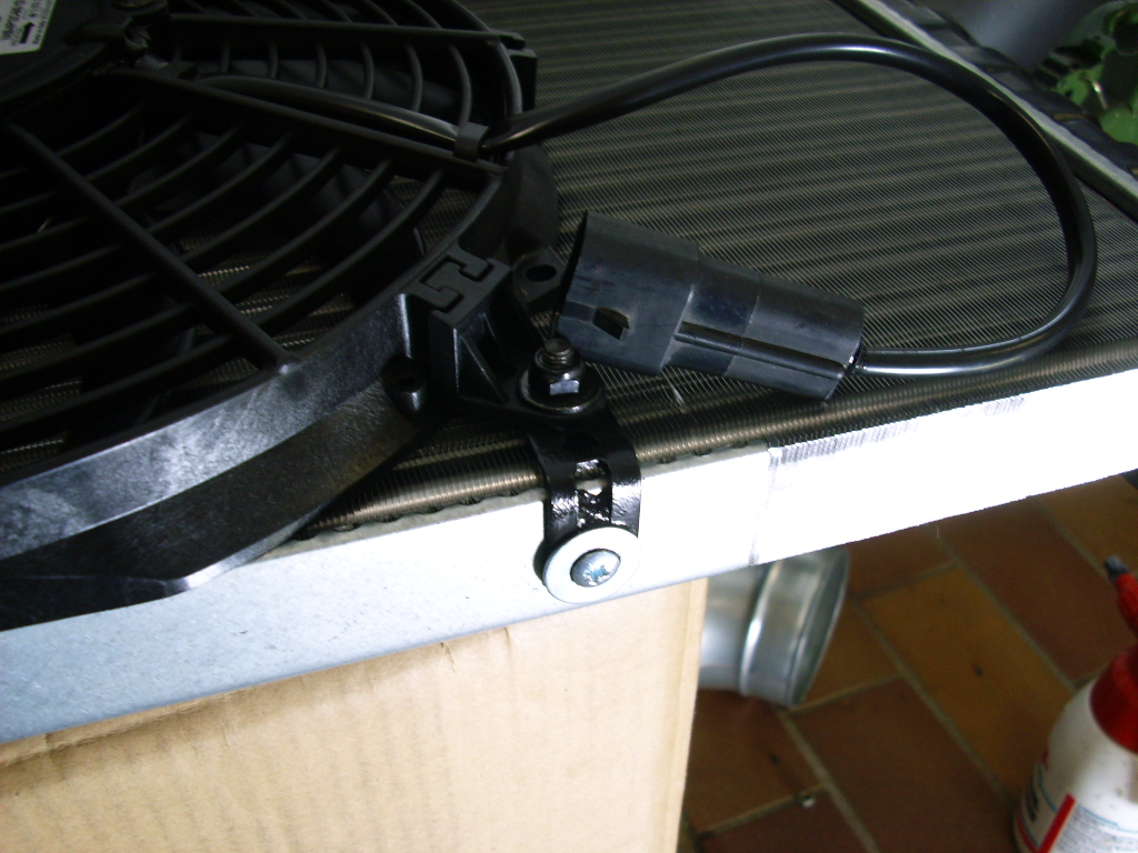 Natürlich ließ ich es mir nicht nehmen einen neuen Valeokühler zu kaufen nur um gleich daran rumzubohren. Den obligatorischen blasenden Spallüfter kann man mit den Befestigungslaschen wunderprächtig an der Blechverstärkung verschrauben. Originalen Stecker drangetüdelt.