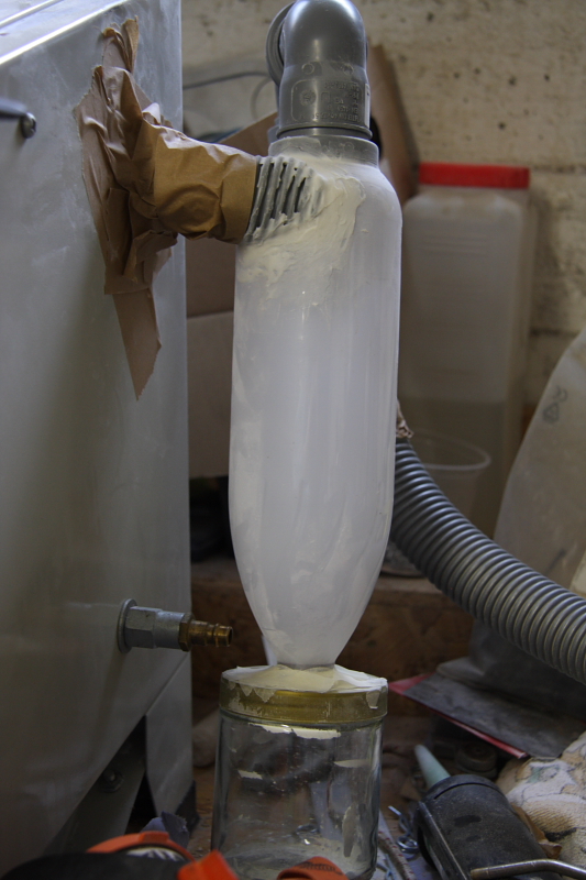 von innen abgedichtet. Funktioniert bis jetzt einwandfrei. Für die Abluft hab ich aus ner Colaflasche, nem Honigglas, PVC-Rohr/Bögen und einem Stück Staubsaugerschlauch nen Zyklonabscheider gebastelt. Ganz nach MacGyver-Style natürlich mit ordendlich Klebeband