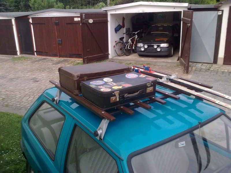 Desweiteren hab ich mir nen Dachgepäckträger gebastelt. Gestern geschweißt, heute die Lattung und Dekogelump drauf gemacht. Morgen werden die Latten noch dunkel lasiert. Bis dass die grün-weißen Kollegen mich anhalten...Muss ja bestimmt auch eingetragen sein der Mist.